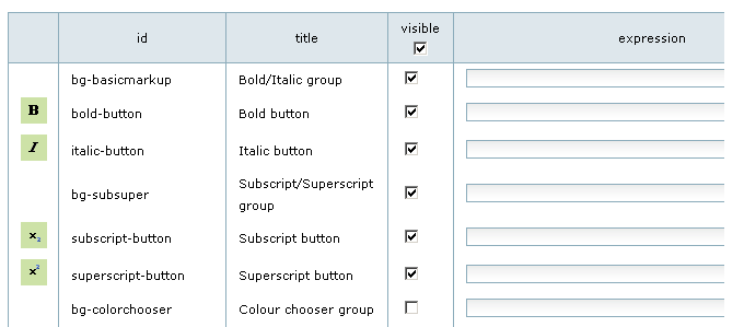 Options suggested allows you to customize Kupu toolbar according to your needs. You may choose Global button visibility that allows you to enter an expression to control the visibility of all buttons together. Go lower and you will find Button visibility:
