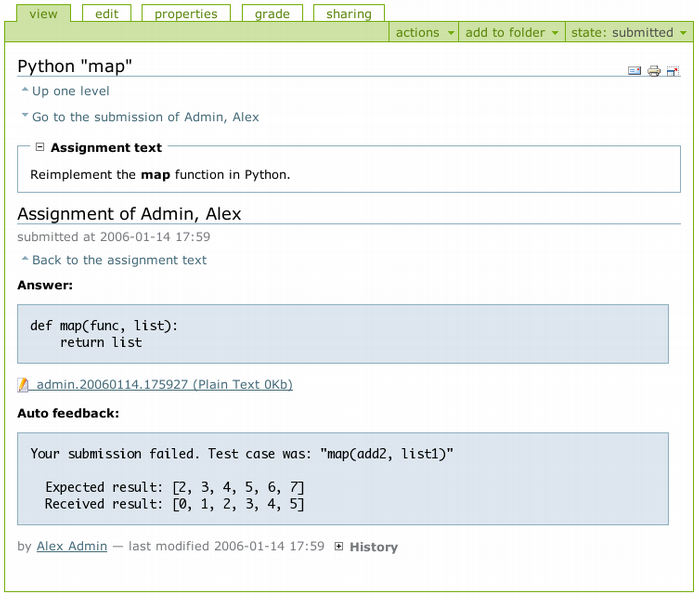 Basically ECAutoAssessmentBox works like ECAssignmentBox. Automatic assessment of programs is handled by ECSpooler (available separately) which manages a submission queue and several backends. When a student submits a program, it is routed to the backend specified by the teacher for this assignment. The results of the tests performed by the backend are immediately returned and displayed.