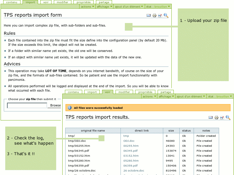 MassLoader adds an action tab to Folders. This action allows to upload a zip file. The zip file is unpacked into the folder.