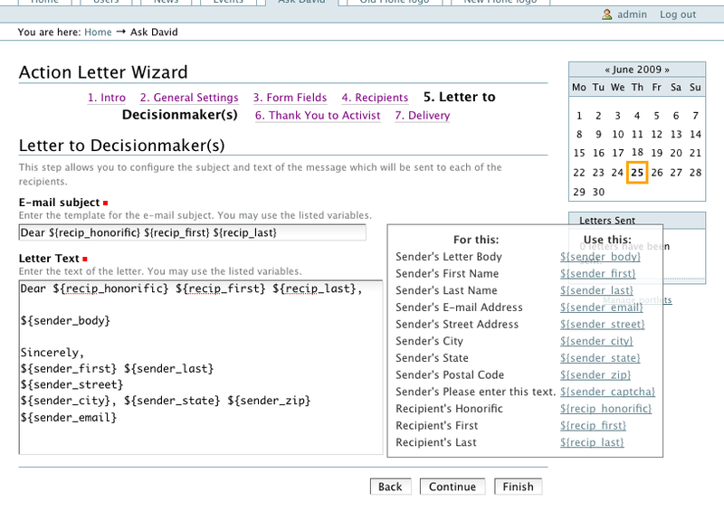 - Because advocacy letter is a fairly complicated PloneFormGen with lots of defaults, we've built collective.z3cform.wizard which lets us make a very user-friendly wizard for building out the advocacy letter. The wizard can be run and then re-run to let a user change the settings. More advanced users can directly edit the PloneFormGen fields and objects to create more complex setups.