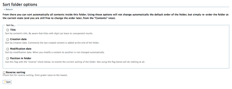 Your "Action" menu will be populated with a new entry: "Sort folder". This will give to the user a Plone form where he can perform common sort operation.