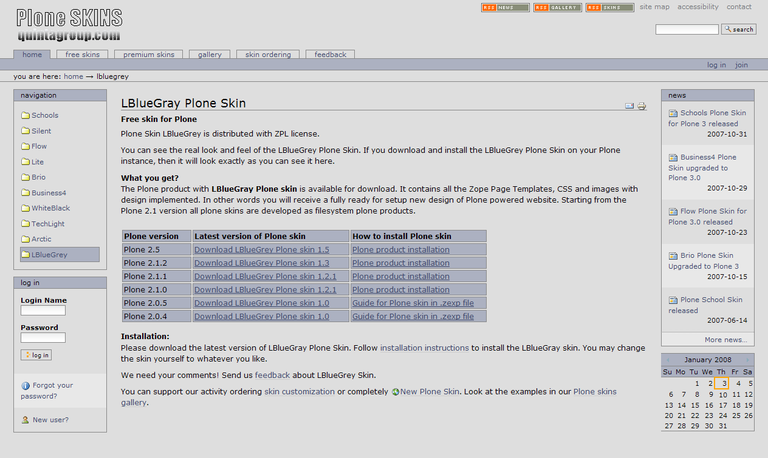 - LBlueGrey Plone skin download link: http://prdownloads.sourceforge.net/quintagroup/qPloneSkinLBlueGrey-1.3.zip?download