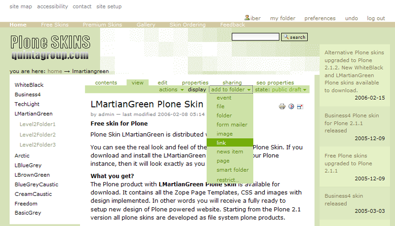 - LMartianGreen Plone Skin download link: http://plone.org/products/lmartiangreen-plone-skin/releases