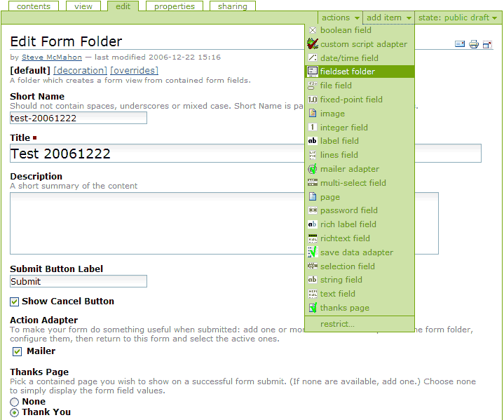 To use it, create a form folder, then add form fields as contents. Individual fields can display and validate themselves for testing purposes. The form folder creates a form from all the contained field content objects.
