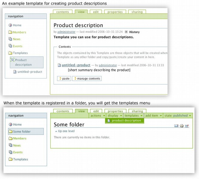 First you create a Template object somewhere in your portal. Just like any other object using the Add new menu. This Template object is in fact a folder that can contain any other portal object (one or more!). In our example, we create a Page inside this Template. We edit this Page and we write its boiler plate body text (and whatever else you wish to preset) and you save the Page. Then you can write optional usage instructions in the Template object (edit tab) itself. This is all you need to do to define the template. Of course you can also copy/paste any existing objects inside the