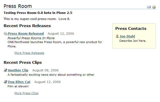 Press Room is a simple add-on product which can be used to easily manage an online Press Room within your Plone site. It adds 4 new content types to your Plone site including a Press Release, a Press Clip (i.e. an outside news piece), and a Press Contact (someone who might be available to speak to the press.)