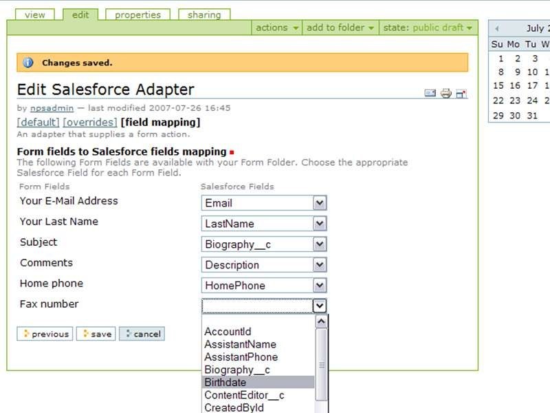 Using the wonderful foundation that is provided by PloneFormGen (and Plone for that matter), the task of creating a form that collects and validates some desired information is no longer a task that requires developer intervention, but can be done by the content editor with a decent grasp of the Plone user interface. Having this data inside the CMS or emailed is only of limited use however. Salesforce.com provides an extensible, powerful platform from which to do Customer Relationship Management (CRM) tasks ranging from sales, marketing, nonprofit constituent organizing, and customer service. The Salesforce PFG Adapter symbolizes the pragmatic joining of a best of breed CMS and CRM so that each can focus on its own strengths in a way that is easy for non-developers to use.