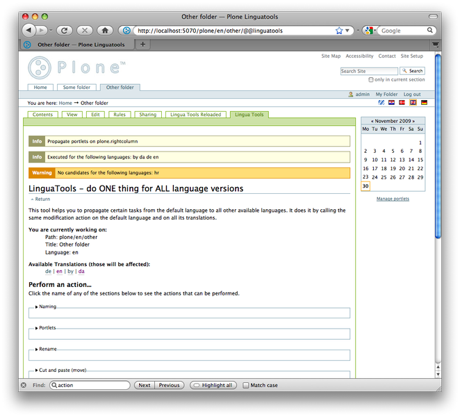 The first version of this tool featured a manually written BrowserView. During the Plone-Conference 2009 sprint, a second version that uses z3c form was written. This is the version visible by default via the "Lingua Tools" tab. The original version is still accessible under @@linguatools-old.