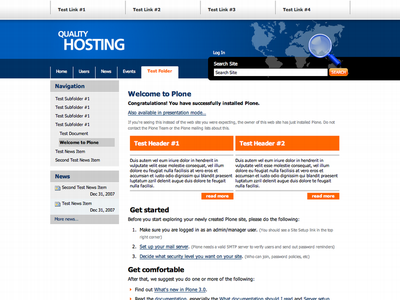 Plone theme, made for hypothetical hosting company. We made our best to include features that might be useful for such kind of company. Additional set of navigational links at the most top of the site are the actions, that can be customized by yourself (change title, URL, number of these links). We have also included styles for new kind of table in content that you can add in your visual editor kupu. See example of sych table on the "Document view" screenshot. Theme is driven by Generic Setup installation mechanism.
