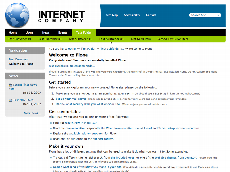 First of all - 2 levels for global navigation. If the current section has sublevels - you will see them in the lower bar of global navigation. If the current section doesn't have sublebvels, you will get nice green stripe below the navigation bar - have a look at "News listing" screenshot for example. Navigation portlet appears in the 3rd level of depth where global navigation doesn't show sublevels. Theme has a high-level usability - all links react on hovering with either font color or background color or bullet appearing changes. Theme does it's best to follow web 2.0 requirements and is really usable and accessible.